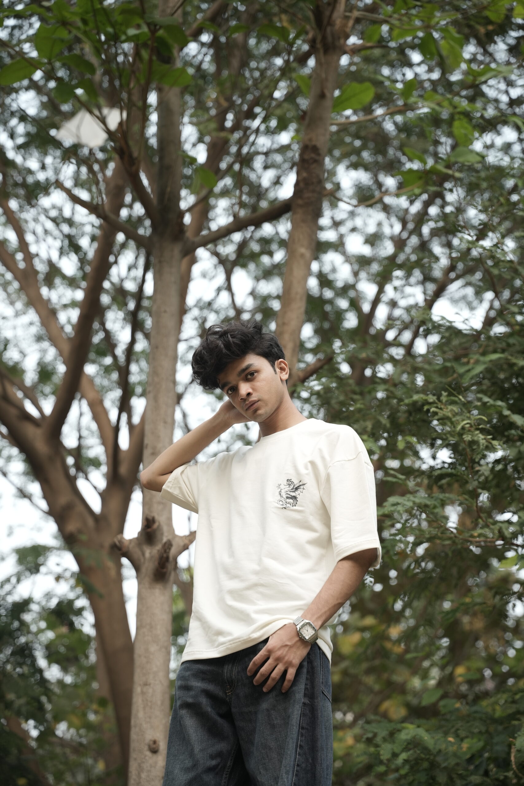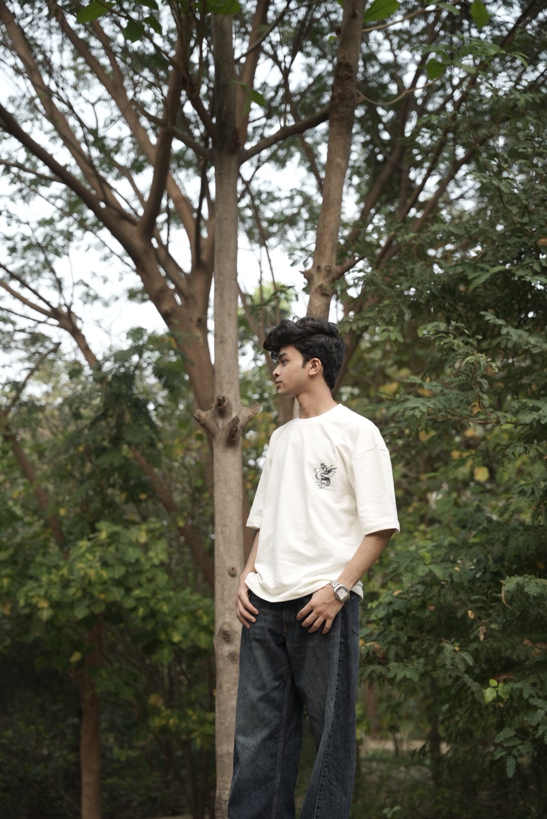 Drop-shoulder streetwear look